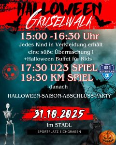 Rund um das letzte Heimspiel unserer KM und U23 gg Alpenvorland am 31.10.2025 erwartet die Besucher ein buntes, gruseliges Halloweenprogramm! Der Sportplatz wird sich in ein Halloween-Land verwandeln.
