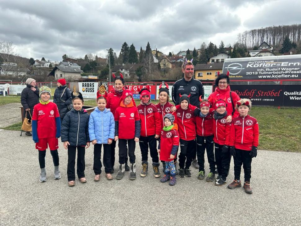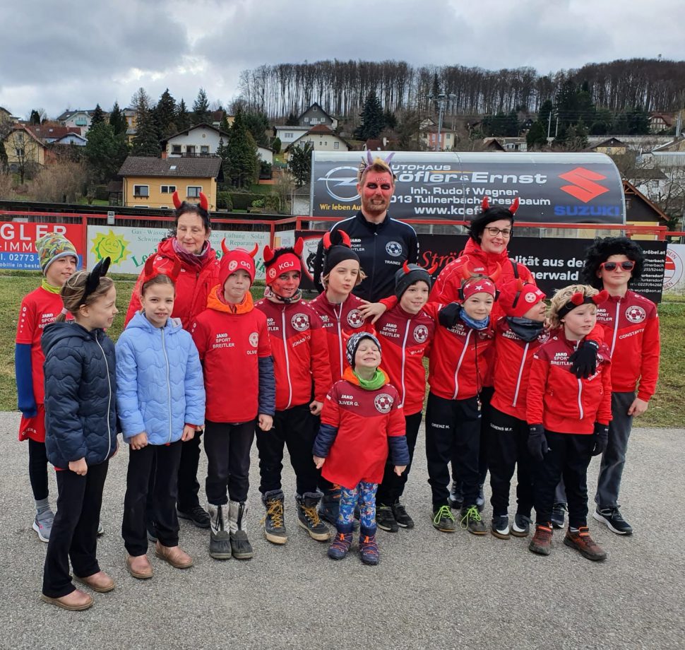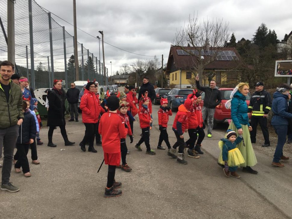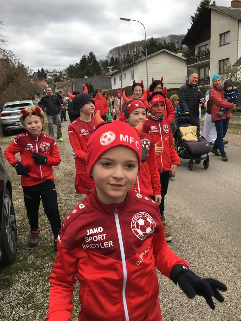 Unsere Nachwuchsspieler:innen waren am Faschingssamstag als die „USVE-Teuferl“ beim Eichgrabner Faschingsumzug unterwegs.