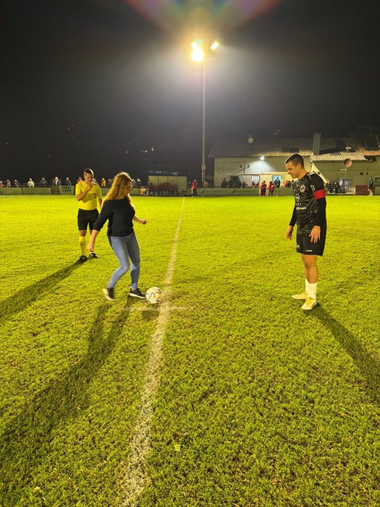 Zum Spitzenderby der Kampfmannschaft übernahm geschäftsführende Gemeinderätin Stefanie Anderlik die Ballspende und kickte das Spiel an.