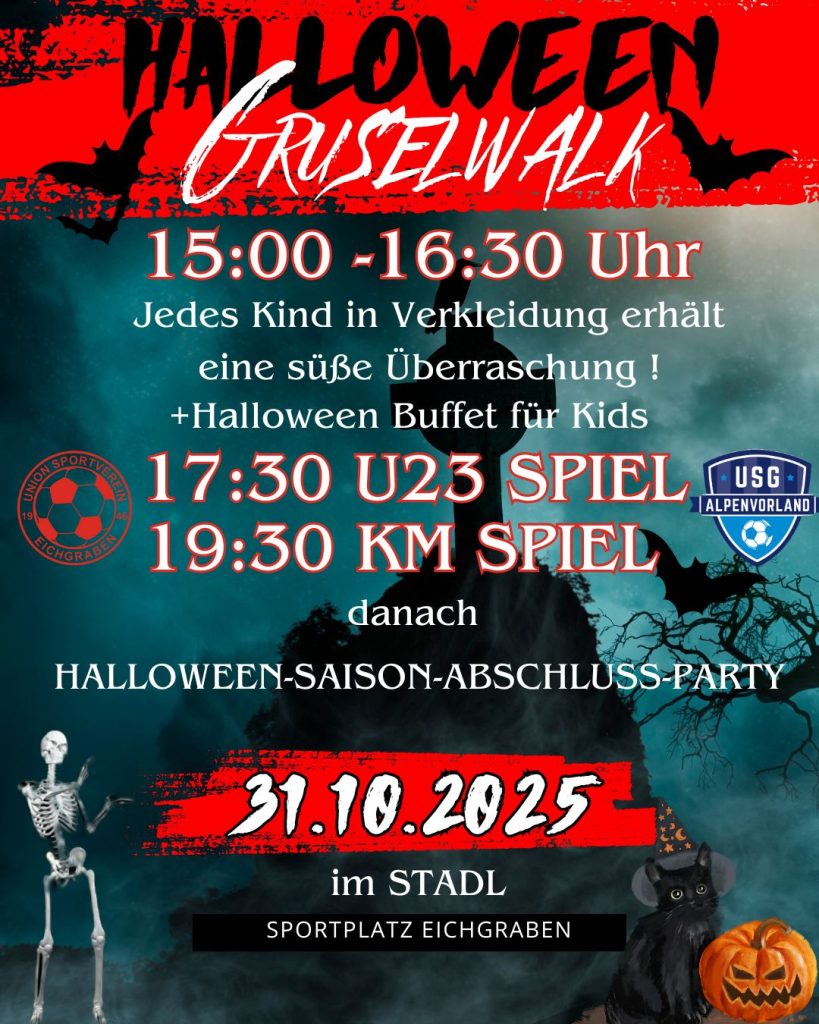 Rund um das letzte Heimspiel unserer KM und U23 gg Alpenvorland am 31.10.2025 erwartet die Besucher ein buntes, gruseliges Halloweenprogramm! Der Sportplatz wird sich in ein Halloween-Land verwandeln.